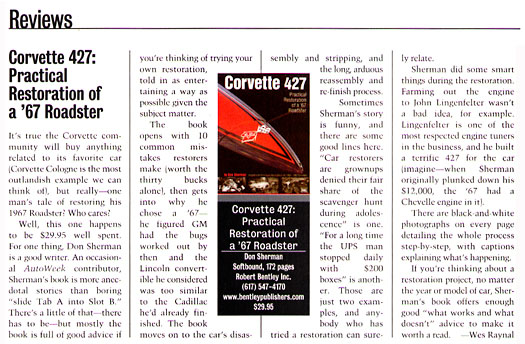 Well, this one happens to be $29.95 well spent. For one thing, Don Sherman is a good writer. An occasional AutoWeek contributor, Sherman's book is more anecdotal stories than boring "slide Tab A into Slot B." There's a little of that-there has to be-but mostly the book is full of good advice if you're thinking of trying your own restoration, told in as entertaining a way as possible given the subject matter.