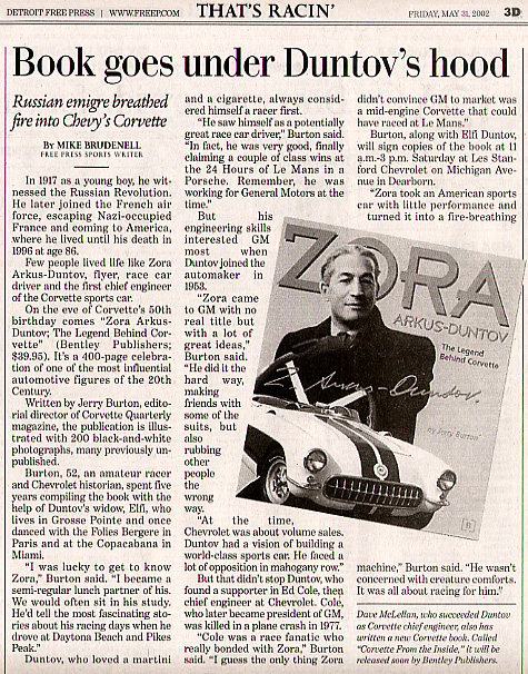 On the eve of Corvette's 50th birthday comes ?Zora Arkus-Duntov; The Legend Behind Corvette? (Bentley Publishers $39.95).  It's a 400-page celebration of one of the most influential automotive figures of the 20th Century.