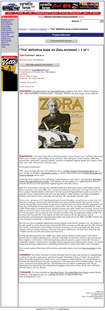 Comments: For more information on Zora Arkus-Duntov: The Legend Behind the Corvette contact Bentley Publishers, 1734 Massachusetts Av, Cambridge MA 02138. Tel: 800-423-4595 Web: www.bentleypublishers.com