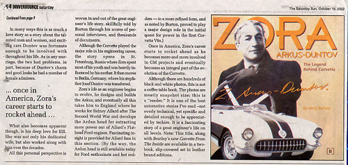 Biographer Jerry Burton, met and became a close friend to Zora and his wife, Elfi, as founding editor of Corvette Quarterly. Elfi has helped promote this comprehensive biography of her late husband"s life, as I noted in Detroit for the Woodward Cruise in the summer that she and the author had signed copies.  At first, that might not sound unusual, but considering the detailed information on this Russian-Jewish immigrant"s personal life, as well as engineering career, she is to be admired.