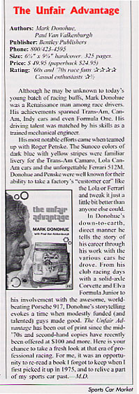 In Donohue's down-to-earth, direct manner he tells the story of his career through his work with the various cars he drove. From his club racing days with a solid-axle Corvette and Elva Formula Junior to his involvement with the awesome, world-beating Porsche 917, Donohue's storytelling evokes a time when modestly funded (and talented) guys made good. The Unfair Advantage has been out of print since the mid-'70s and second-hand copies have recently been offered at $100 and more. Here is your chnace to take a fresh look at that era of professional racing. For me, it was an opportunity to re-read a book I forgot to keep when I first picked it up in 1975, and to relive a part of my sports car past.